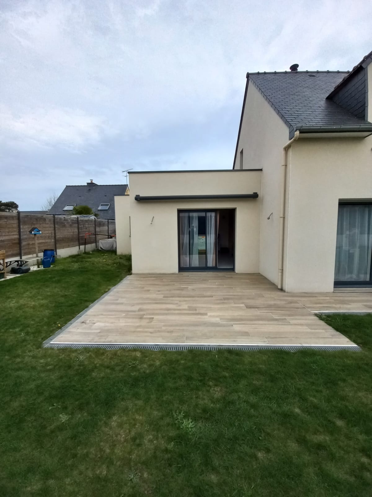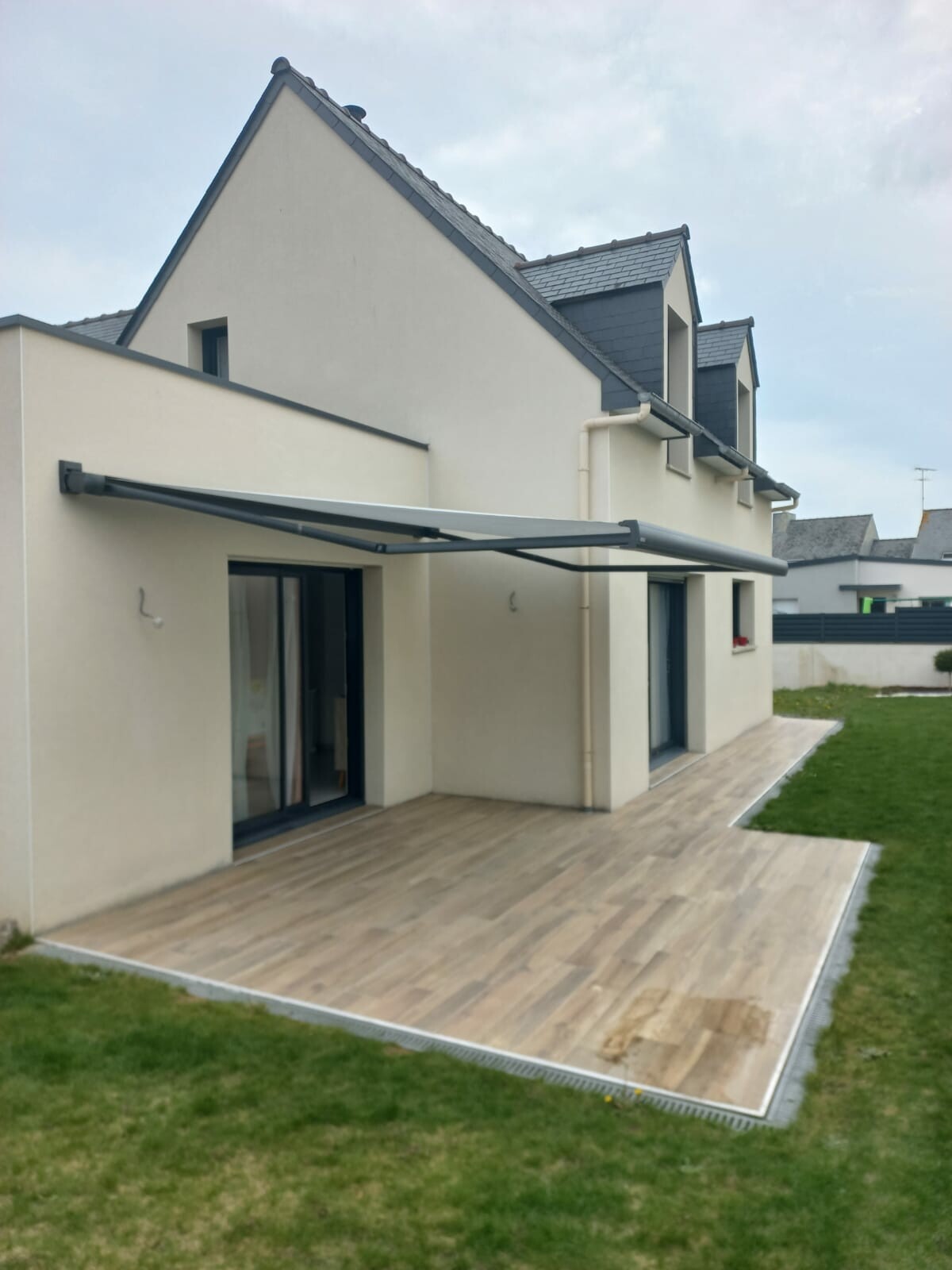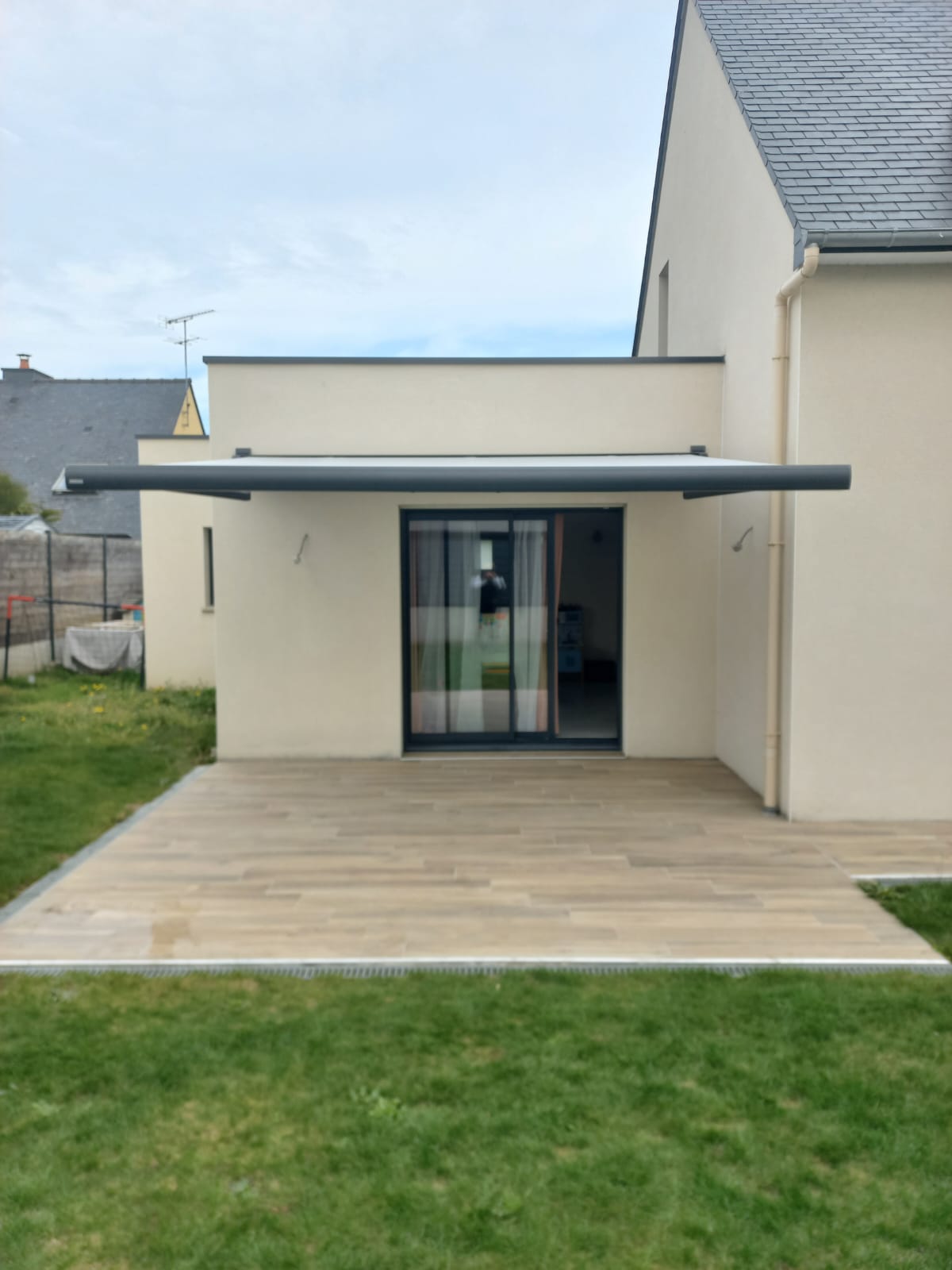 La pose a été réalisée sur mesure, directement en applique sur la façade, avec des finitions soignées. Le store s’intègre parfaitement à l’architecture de la maison. Un vrai plus pour profiter de la terrasse en toute saison.